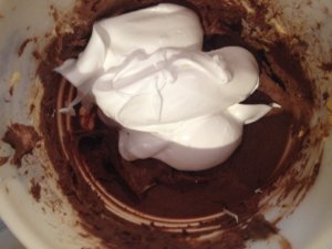 A 20 dkg vajat cukorral robotgép segítségével habosra kevertem, amíg sima egyenletes krémszerű állaga nem lett a masszának. Ezután a keverékhez adtam 4 tojás sárgáját, 1 tasak vaníliás cukrot és az egy egész tojást. A keveréket addig kevertem, amíg egy fényes szép egyveleget nem képezett a sok összetevő. A kimért lisztet nagykanállal kezdtem adagolni a masszához, de meglepetésemre a receptben szereplő 45 dkg liszt nagyon soknak bizonyult. Így a visszamérés alapján összesen csak 20 dkg liszt került a masszába. A massza állaga kissé kötött és nehéz. A masszát kétfelé vettem majd az egyik adagba 3 kanál holland kakaóport tettem és egyenletesen kikevertem. A 4 darab tojás fehérjét kemény habbá felvertem, majd kétfelé szedtem és a masszákhoz adagoltam.
